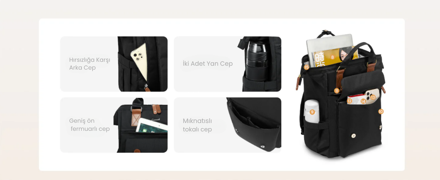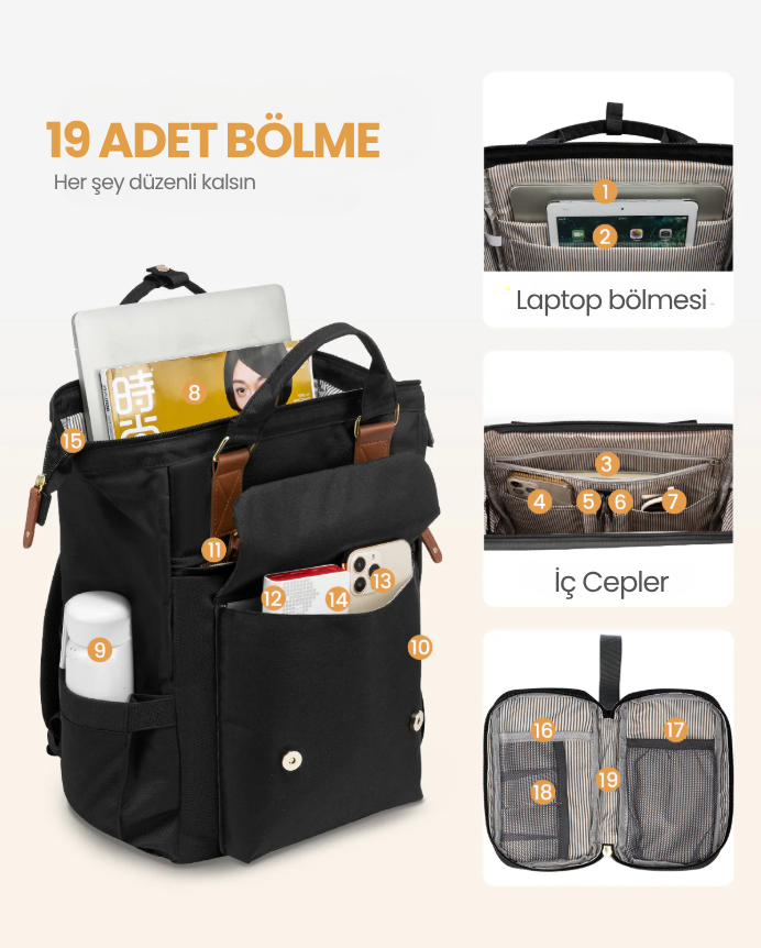 🔒 Arka gizli cep ve fermuarlı iç bölmeler ile değerli eşyalar için ekstra güvenlik.
