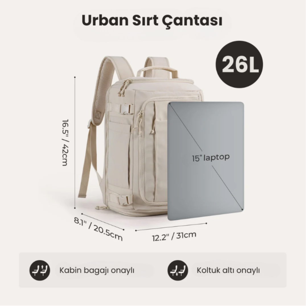 ✈️ 26 litrelik kapasitesiyle bu sırt çantası, çoğu havayolunun kabin boy standartlarına uygundur.