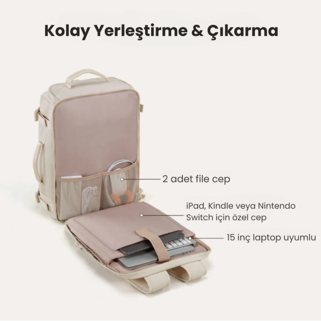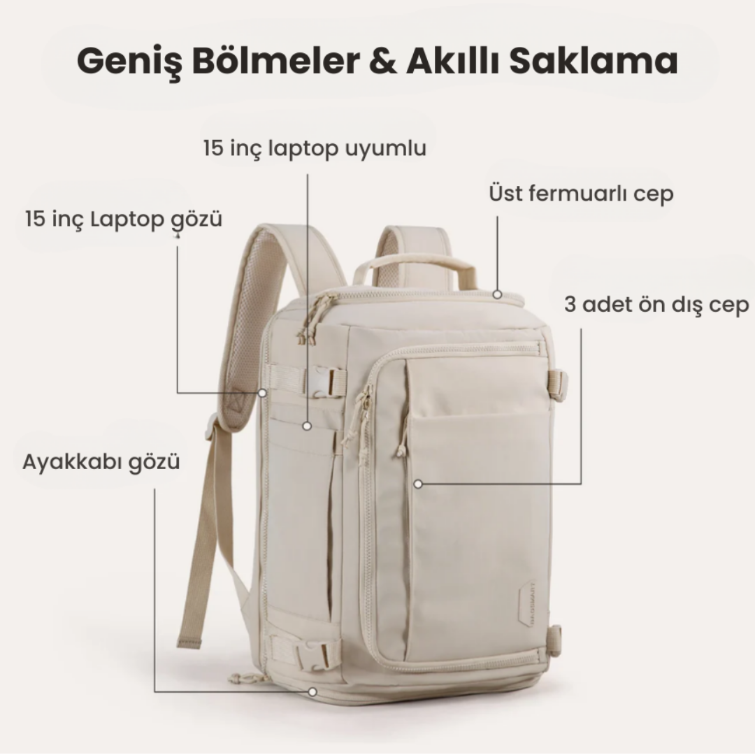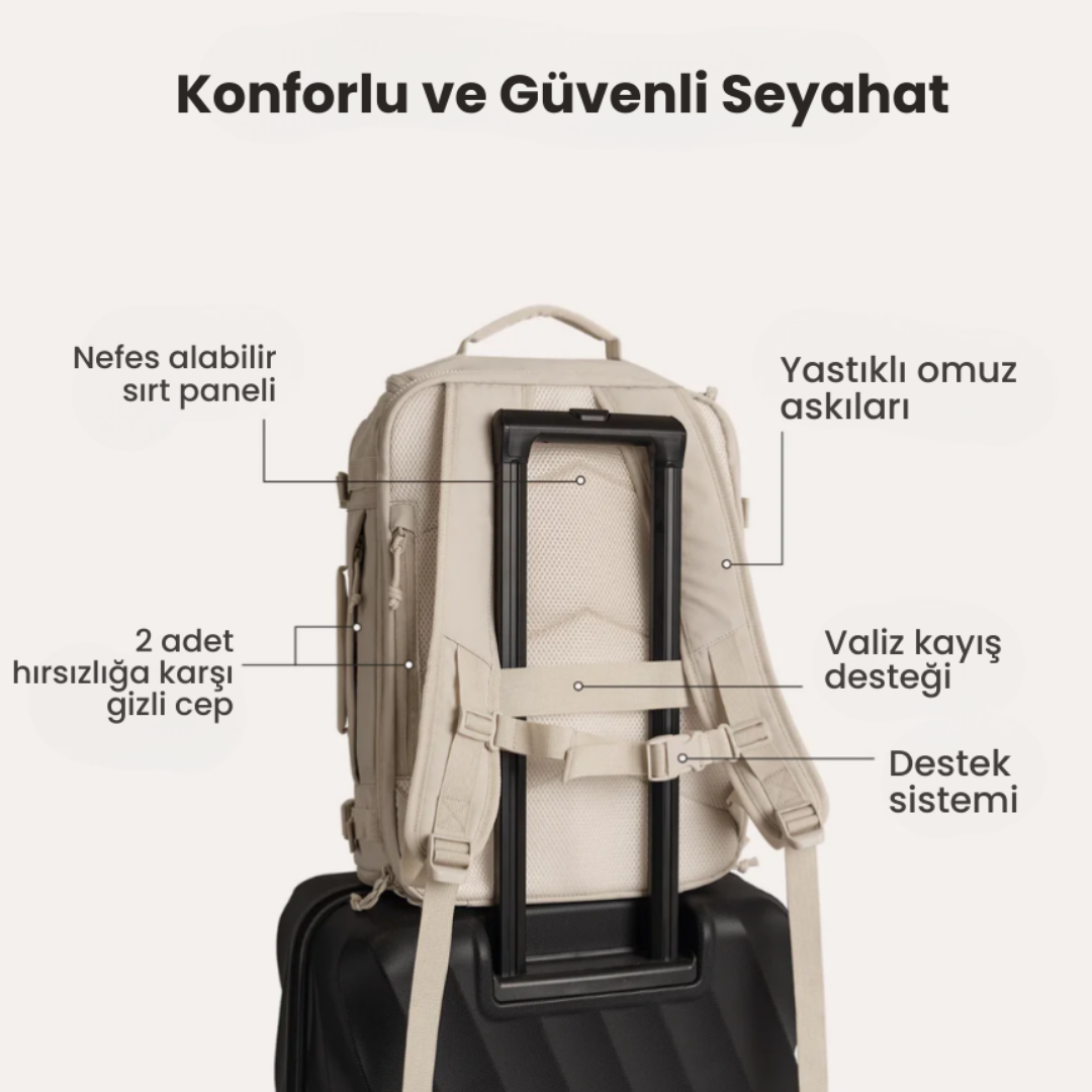 🎒 Suya dayanıklı naylon kumaşı, nefes alabilir sırt paneli ve yastıklı omuz askılarıyla seyahatinin en konforlu arkadaşı.